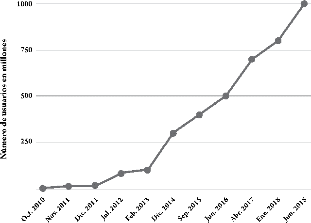 Desde su lanzamiento en octubre de 2010, Instagram ha logrado atraer a más de 1000 millones de usuarios en todo el mundo. Más de 500 millones de ellos se conectan a diario y el 80 % siguen a alguna empresa en esta red (business.instagram.com, con datos obtenidos el 20 de enero de 2019) (figura 2).
