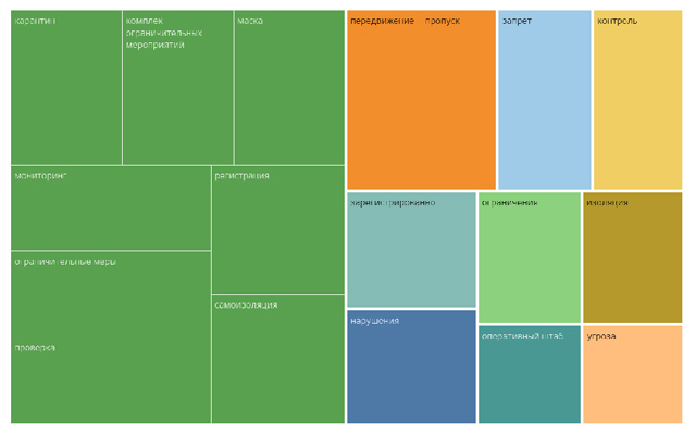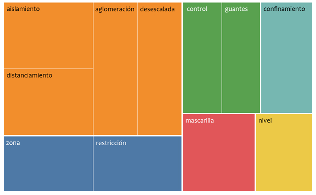 Al discutir las medidas para combatir la pandemia, los actores se enfocan en el aislamiento, la cuarentena, el control sobre los ciudadanos, la necesidad de mantener la distancia, la efectividad de otras medidas. Se distingue claramente la especificidad de la toma de medidas en España, que se diferencian entre sí por la presencia de restricciones según el nivel de contagios en una determinada región, donde nivel y zona toman su fuerte posición junto a otros conceptos vitales para los españoles, como control, mascarilla, guantes, cuarentena, etc. En determinados períodos, pasó a primer plano el tema de la flexibilización de las restricciones.