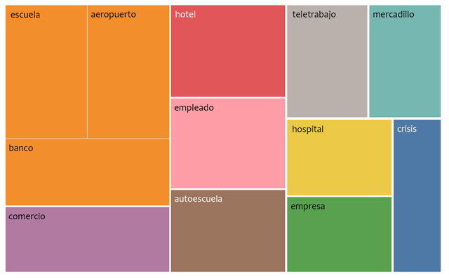 La crisis provocada por la pandemia ha obligado a los usuarios de habla alemana a prestar especial atención a los cambios en el mundo del trabajo, en la relación entre empresarios y empleados, la dinámica de las campañas y el funcionamiento de los aeropuertos y hoteles. Muestran gran preocupación por el sector turístico, ya que la posibilidad de poder viajar es muy relevante en Alemania. La situación es muy similar a la que señalan los datos españoles. Se les da un peso importante a los cambios forzados en la educación escolar y se denota el descontento y la protesta de los padres. A pesar de los cambios significativos en el mundo del trabajo, el concepto de teletrabajo no surge en alemán como en español. Una posible explicación de la falta de este concepto en el corpus alemán es el hecho de que el teletrabajo era bastante más común en países germanoparlantes, con desarrollo tecnológico más avanzado.