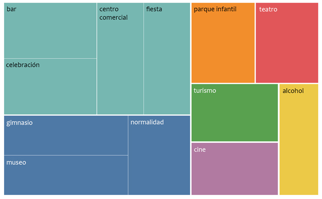 Para los actores de habla hispana, el tema del pasatiempo específico durante el período de covid-19 resultó ser muy relevante. Las características de las actividades de ocio, las celebraciones familiares, las visitas a bares, el consumo de alcohol, así como los parques, los museos, los cines, los teatros, los centros comerciales y los gimnasios se debatieron tan activamente como el regreso a un estilo de vida normal. No en vano, la designación de fechas significativas como noviembre y diciembre, meses en los que se concentran la mayoría de las fiestas tradicionales españolas, también ocupó su lugar entre las palabras más citadas.