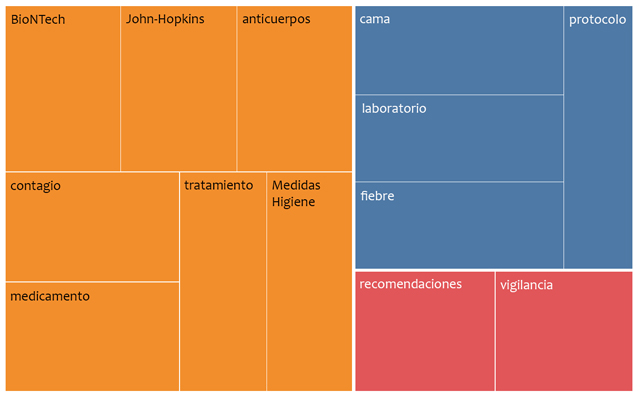 La información expresada explícitamente, resaltada en la estructura temática de la base de datos en español, está determinada por las nominaciones: covid/coronavirus, salud/salud pública, pandemia, mascarilla, riesgo, seguridad, zona, nivel. El tema presenta los problemas de la propagación de la pandemia, las preocupaciones de los actores hispanoparlantes sobre las consecuencias para la salud, el estado del sistema de salud y las medidas anticoronavirus (Figura 1).