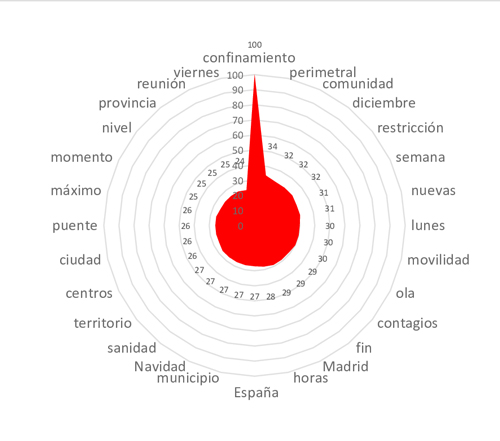 Se ven reflejados claramente los principales aspectos y temas que han marcado esa primera etapa del desarrollo de la pandemia. Se observa la presencia de tales elementos destacados, como: Madrid, tratándose del lugar donde se detectaron los primeros contagios en España y donde la situación estaba más grave, contagios, ola, restricciones de movilidad, limitaciones horarias (lunes, fin de semana), cierre perimetral, la política de prevención orientada a las fechas claves de celebraciones y fiestas importantes para los españoles: Navidad, puente de diciembre, etc.