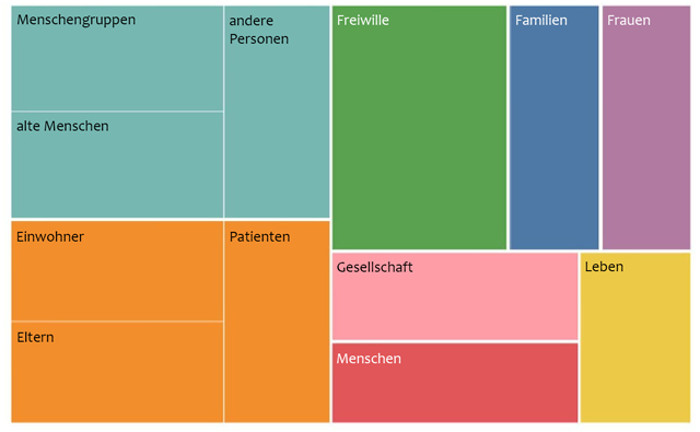 Para los actores de habla alemana, resultó ser más relevante discutir las consecuencias del impacto del coronavirus en varios grupos de la población, sobre todo los más vulnerables, que difieren en edad, capa social y género. En comparación con la base de datos española, hay pacientes, personas mayores, padres, pero tampoco están hombres, empresarios y profesores, aunque se menciona sociedad, voluntarios y residentes.