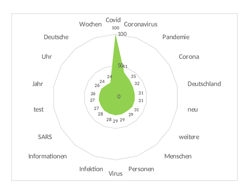 La información expresada explícitamente, que constituye la estructura temática de la base de datos en idioma alemán, representa una gama limitada de temas relacionados con la propagación de la infección por coronavirus, en contraste con la red semántica, que representa una serie de agrupaciones semánticas con información implícita. Llama la atención que en este lenguaje los conceptos de coronavirus vayan mayoritariamente acompañados de temas sobre la importancia de las personas y de alguien en una situación determinada, mientras que en la red española afloraron más medidas de seguridad específicas.