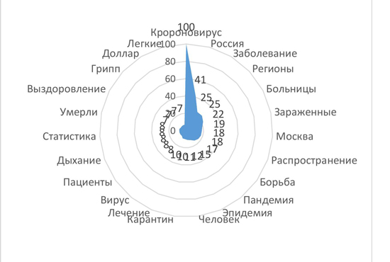 En contraste con la estructura temática limitada, la red semántica está representada por numerosos y variados componentes, lo que refleja una amplia gama de problemas que atrajeron la mayor atención de los actores de habla rusa durante la propagación de la infección por coronavirus. El análisis de la red semántica permite identificar acentos semánticos, información explícita oculta detrás de las discusiones sobre la pandemia. Después de construir la red semántica, se extrajo el núcleo, que consiste en una nominación con un peso de enlace de 98-100. Un análisis textual del núcleo semántico mostró que los numerosos componentes que forman la red semántica se pueden dividir en varios bloques temáticos que determinan los problemas clave más importantes para los actores en un período determinado.