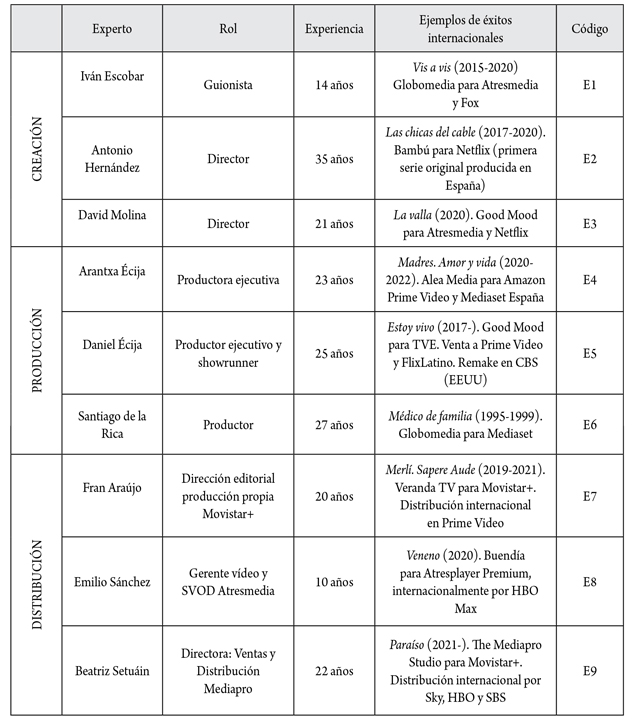 Los expertos han sido seleccionados a partir de diferentes variables. Primero, debían representar a los tres ámbitos por excelencia de la industria audiovisual (clasificados por OEA, 2022): creación, producción y distribución. Segundo, debían contar con una trayectoria profesional superior a 10 años, para poder narrar la evolución de la industria y el impacto en la producción nacional del asentamiento de los actores internacionales y los cambios en los hábitos de consumo audiovisual. Tercero, debían haber participado en producciones españolas con notable impacto internacional, para desde su experiencia reflexionar acerca de los motores de éxito de estas ficciones.