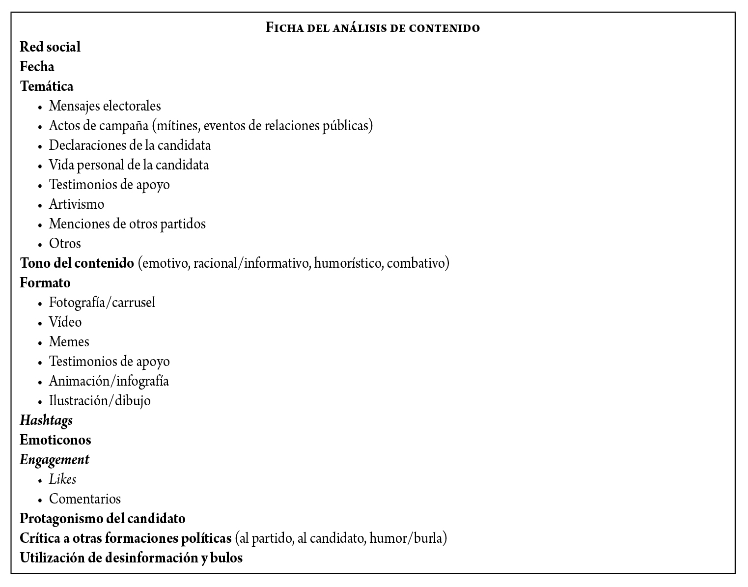 El trabajo de campo se basa en la utilización de tres técnicas de recogida de datos: la entrevista en profundidad con los responsables de la campaña que se estudia, la observación no participante y, por último, el análisis de contenido de las publicaciones del BNG y de la candidata en las redes sociales Instagram y TikTok durante las elecciones al Parlamento Gallego. El periodo de análisis abarca la campaña electoral del 2 al 18 de febrero de 2024. En total, se analizaron 407 publicaciones.