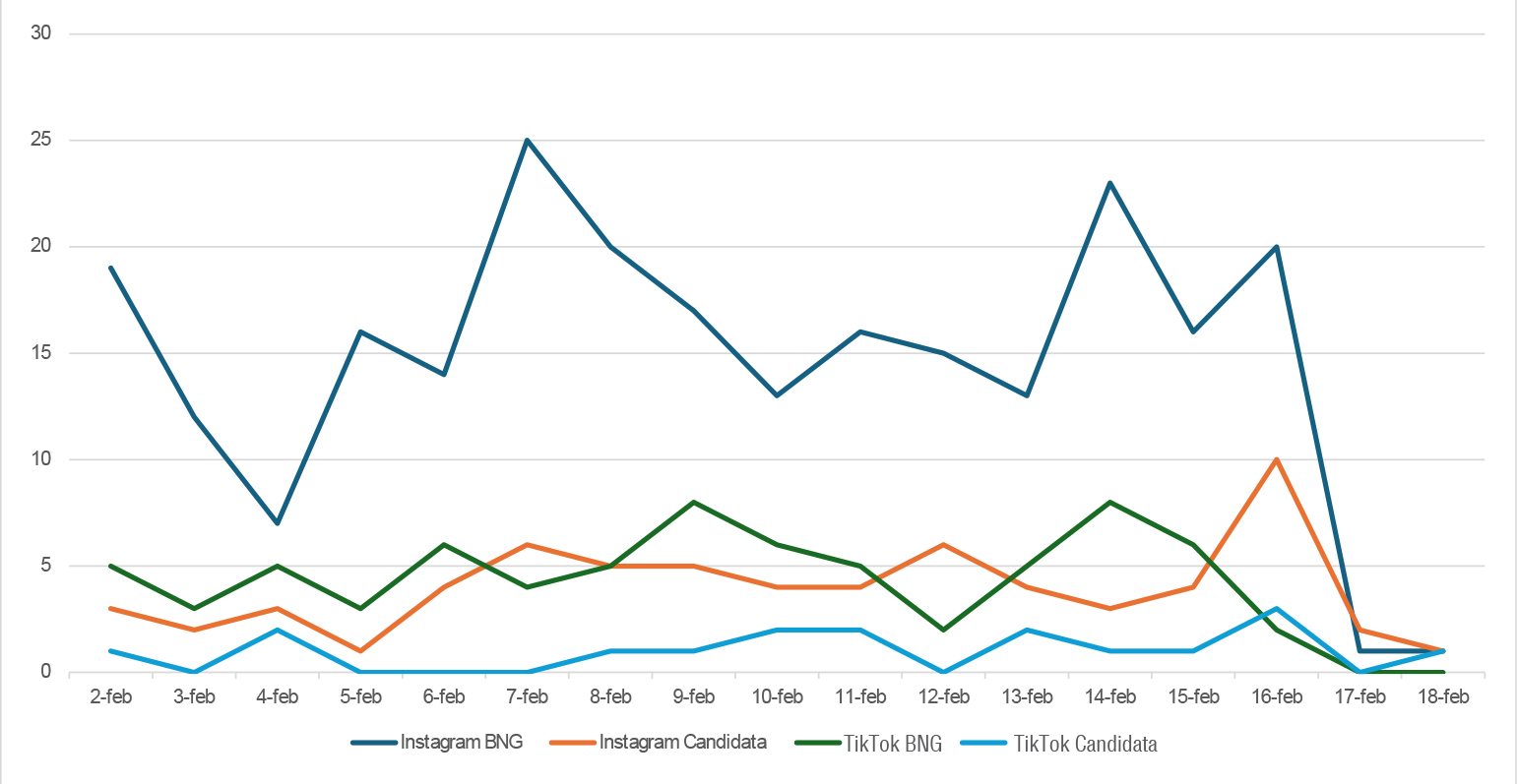 Los datos revelan una estrategia de comunicación intensiva en ambas plataformas, con un pico significativo de actividad en Instagram el 7 de febrero, donde el BNG tubo 25 publicaciones veces y la candidata seis. En TikTok, aunque con menos frecuencia general, se observó un máximo de ocho publicaciones tanto del partido como de la candidata el 9 y el 14 de febrero, respectivamente. Los días 17 y 18 de febrero marcan una caída en las publicaciones, coincidiendo con la jornada de reflexión y el día de la votación.