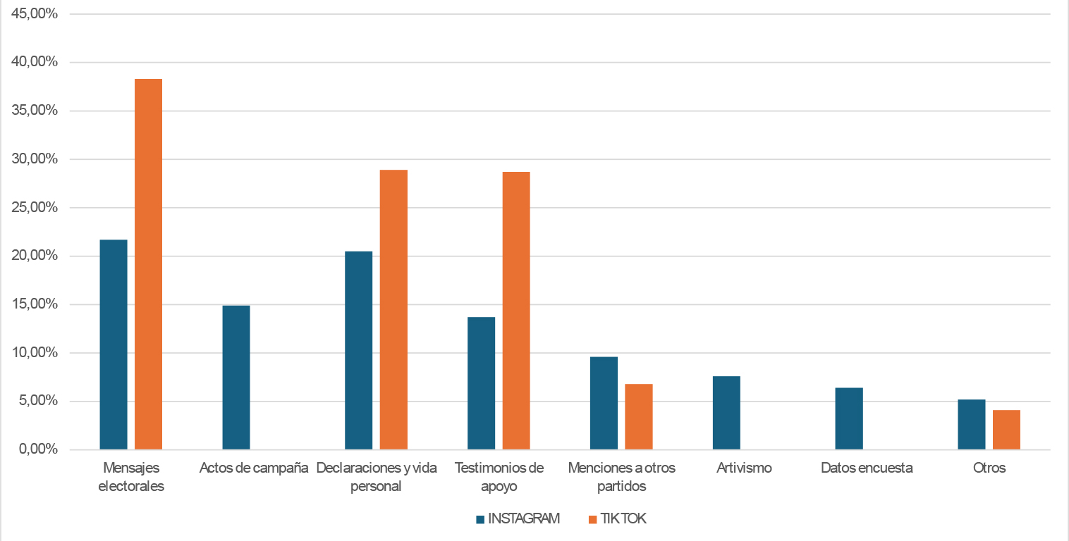 Los contenidos temáticos de la red TikTok registran cambios significativos comparados con los de Instagram, pues no hay publicaciones sobre actos de campaña ni artivismo ni datos de encuestas. Además, el peso de los mensajes electorales es mayor, con un 38,3%, y los testimonios de apoyo, con un 28,7%, superan a las declaraciones de la candidata. Las menciones a otros partidos, con un 6,8%, y otros, con un 4,1%, son casi irrelevantes.