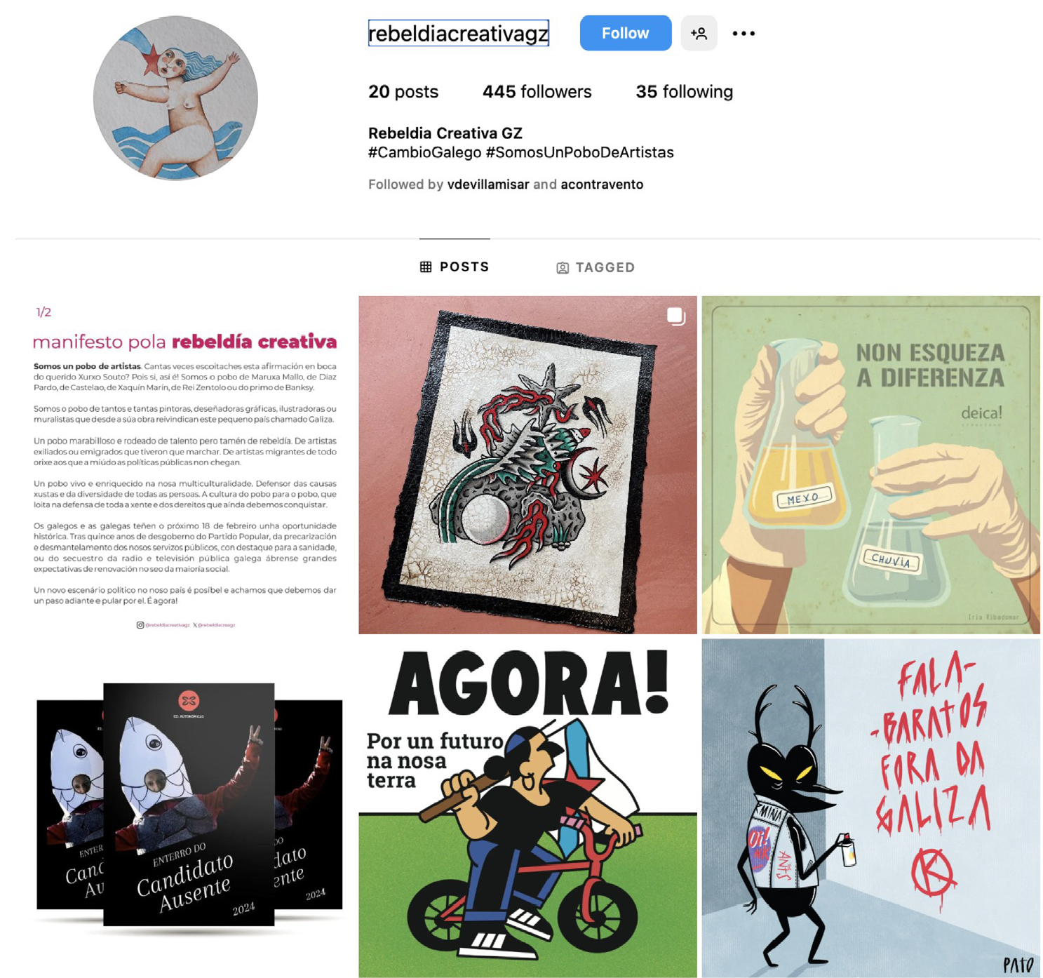 En este sentido, 30 artistas gallegos firmaron un manifiesto en el que reclamaban un nuevo escenario político y crearon el perfil @rebeldiacrea-tivagz para compartir contenidos de apoyo al BNG y crítica al PP. Los firmantes del "Manifiesto por la rebeldía creativa" hacen un llamamiento para no quedar callados y sumarse al cambio gallego a través de acciones creativas que sirvan para visibilizar una nueva Galicia.