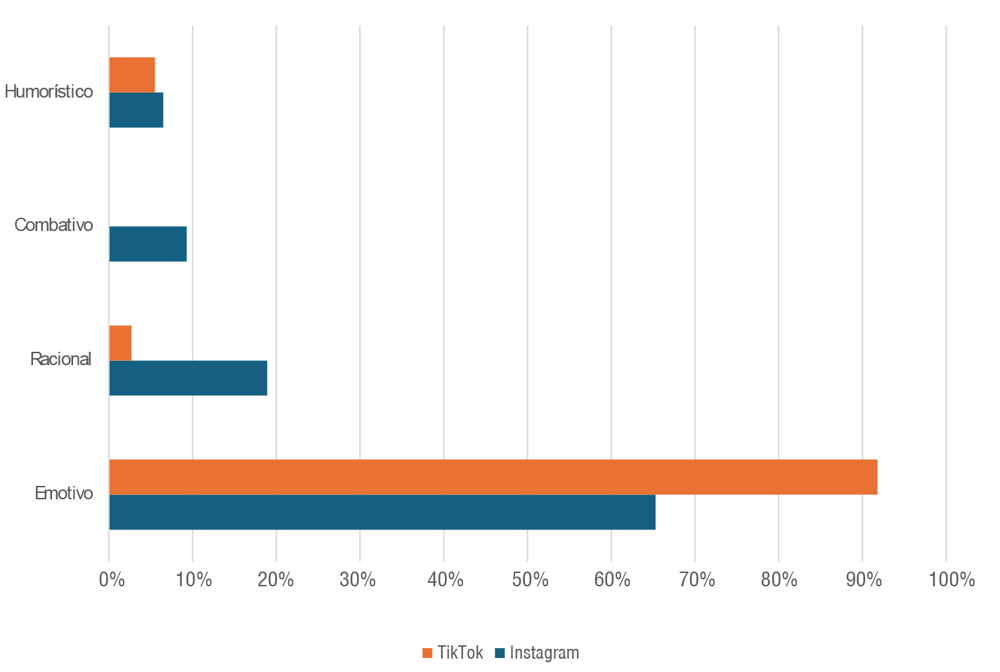 El contenido racional o informativo ocupa un 18,9% en Instagram frente a un reducido 2,7% en TikTok, que no es utilizada para difundir la convocatoria de actos electorales. El tono combativo, que abarca un 9,2% en Instagram, no encuentra lugar en TikTok, donde es nulo. Este fenómeno puede estar asociado con la cultura predominante en TikTok, que desalienta los enfrentamientos directos y fomenta una atmósfera más amable y lúdica. El humor se presenta como un recurso en ambas plataformas, con un 6,5% en Instagram y un 5,4% en TikTok. A pesar de ser el menos utilizado, su papel no es despreciable, ya que el humor puede ser un instrumento efectivo para la crítica política, el alivio de tensiones y la humanización de los candidatos.