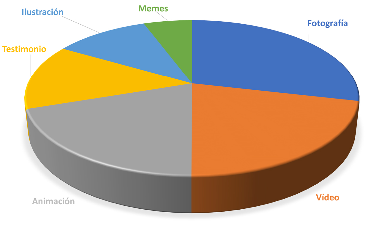 Las fotografías y los vídeos conforman la mayoría, lo que sugiere un énfasis en la narrativa visual, elemento crucial para captar la atención en un flujo de desplazamiento rápido. Las animaciones e infografías, aunque menos prevalentes, cumplen una función estratégica, al promover la interactividad y la retención de información, respectivamente.