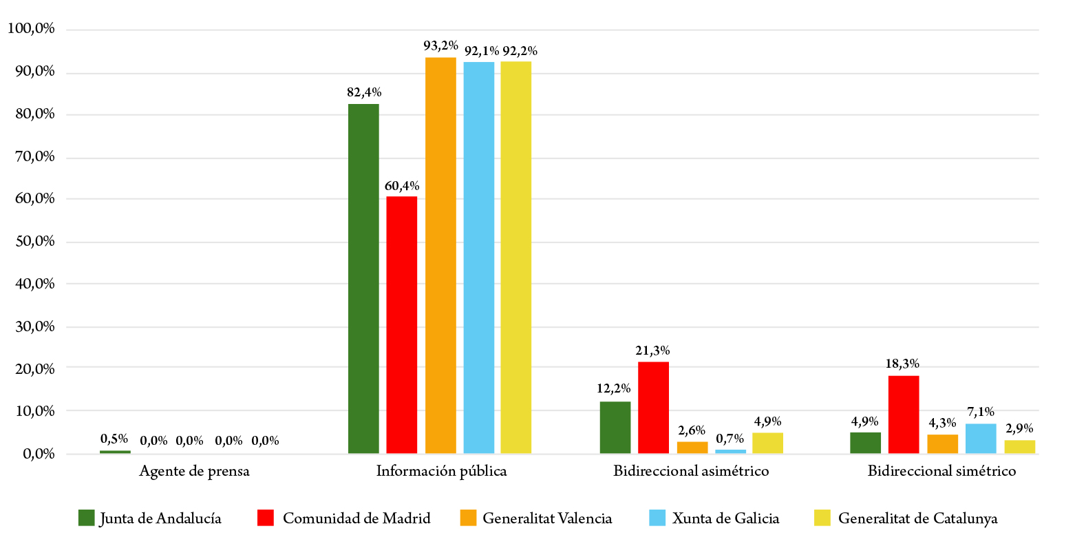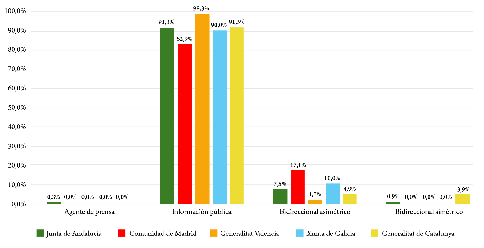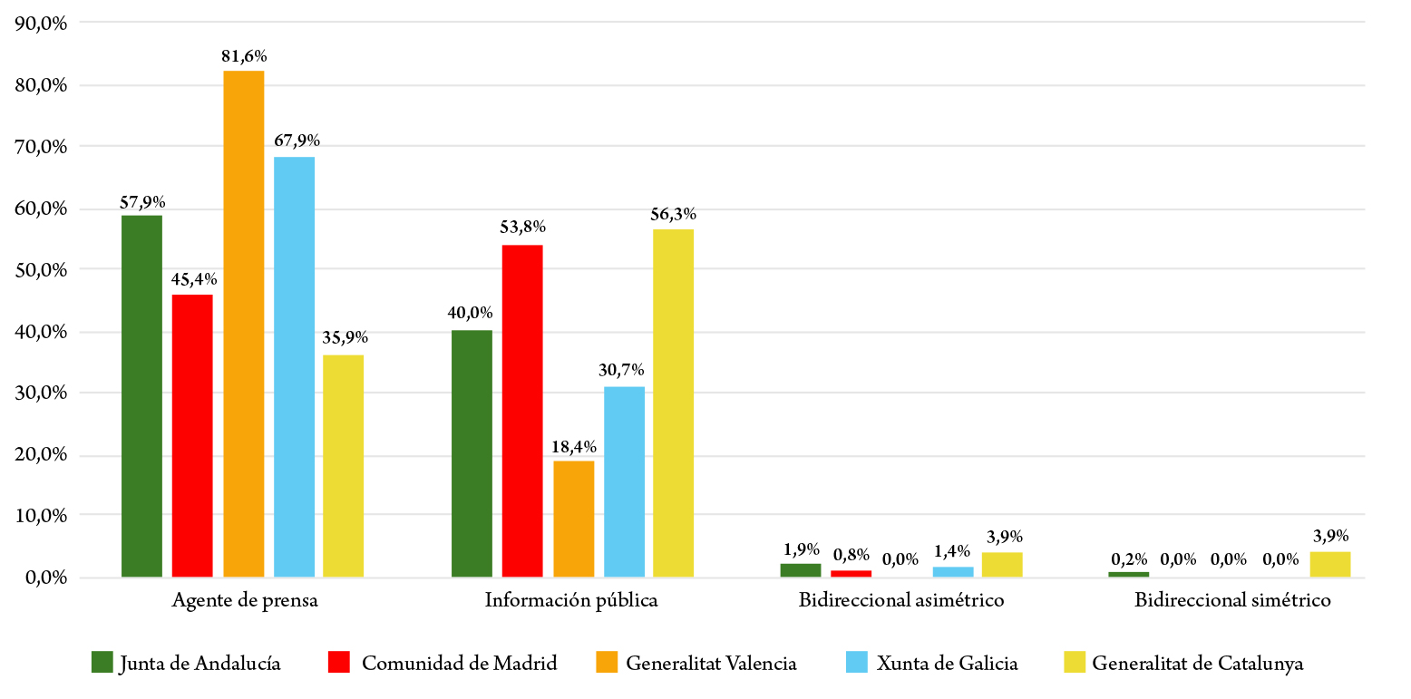 El análisis de las 1290 publicaciones de Twitter (ahora X) de los cinco principales perfiles institucionales autonómicos del Estado autonómico español muestra, en la variable del sentido de la comunicación y el interés hacia los públicos, una predominancia del modelo de agente de prensa con una comunicación unidireccional prácticamente unánime en todas las instituciones analizadas, en las cuales la comunicación unidireccional con interés nulo hacia los públicos destaca con un promedio del 58,82 % junto con el 39,84 % de las comunicaciones en las que, pese a ser también unidireccionales, se identifica un cierto interés hacia los públicos (figura 1).