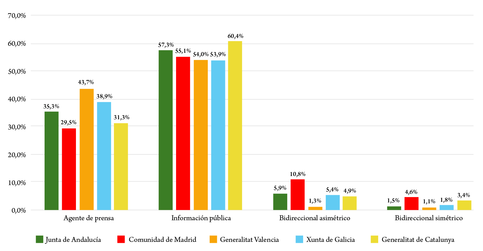 Al llevar a cabo la comparación de los modelos de relaciones públicas predominantes en los perfiles institucionales de la red social Twitter (ahora X) de las cinco comunidades autónomas de España con más seguidores en esta red social, observamos que el modelo que se impone en las cinco instituciones es el de información pública con los porcentajes expresados a continuación: Junta de Andalucía (57,3 %), Comunidad de Madrid (55,1 %), Generalitat Valenciana (54 %), Xunta de Galicia (53,9 %) y Generalitat de Catalunya (60,4 %).