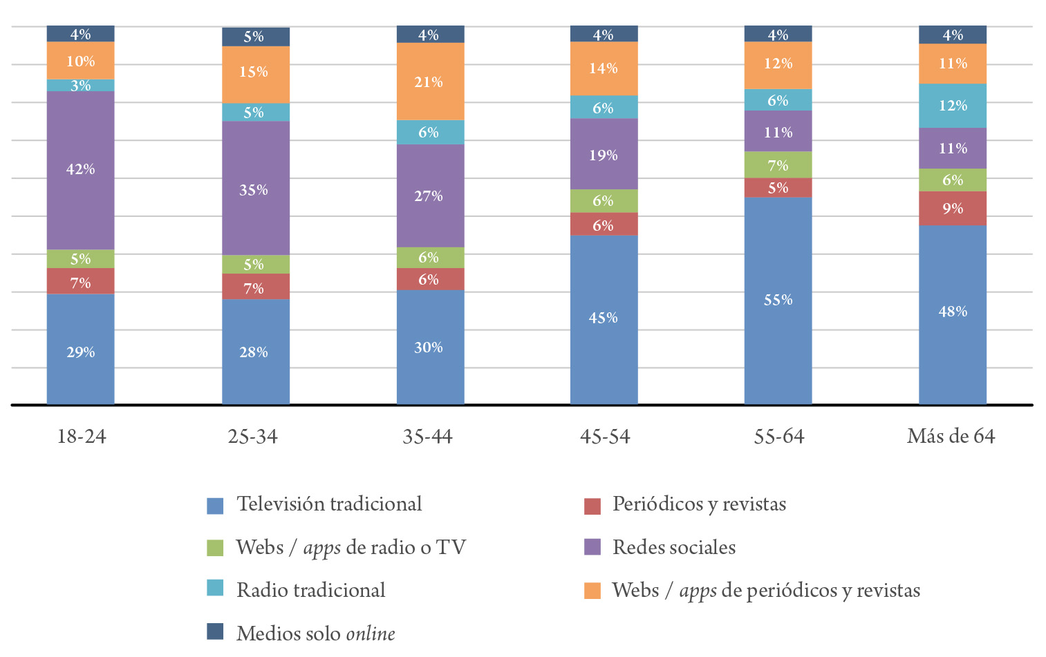 Statista. (2024). Distribución porcentual de la población usuaria de noticias online en función de su medio de comunicación preferido para informarse en España en 2021 por grupo de edad. https://es.statista.com/estadisticas/874413/medios-de-comunicacion-preferidos-para-informarse-por-grupo-de-edad-espana/