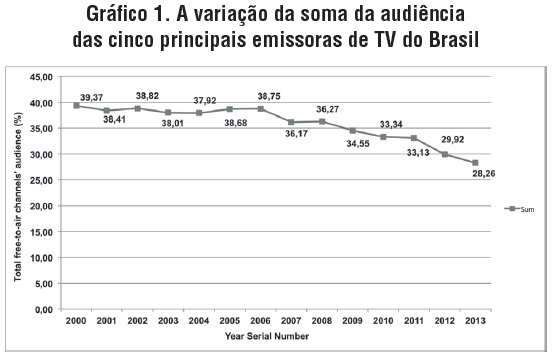O gráfico 1 mostra a variação da soma da audiência dos principais canais. Fazendo uma análise por períodos, os índices variaram pouco entre 2000 e 2006. A audiência somada dos cinco principais canais caiu de 39,37% para 38,75%, uma queda absoluta de 0,62 pontos percentuais, ou 1,6%. Já entre 2006 e 2013, há uma queda acentuada na audiência da TV aberta brasileira. Se em 2006 os cinco principais canais comerciais tinham juntos 38,75% da audiência, em 2013 ela caiu para 28,26%. São 10,49 pontos percentuais a menos. Em termos relativos, 27% (mais de um quarto da audiência) deixaram de ver um dos cinco canais de TV aberta. Considerando todo o período de análise, a queda foi superior a 28%.