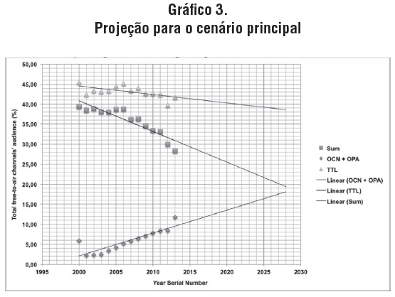 Usando os dados de audiência referentes aos anos de 2000 a 2013, fez-se uma projeção para os próximos 14 anos considerando os dados mais importantes para a compreensão do mercado televisivo: a média da audiência dos canais, a soma da audiência desses canais, a audiência não relacionada à TV aberta, o que inclui a TV paga e outros dispositivos conectados à TV (soma de OCN com OPA), e o total de aparelhos ligados (TTL).